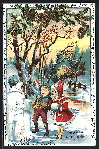AK Kinder betrachten einen Schneemann, Prosit Neujahr