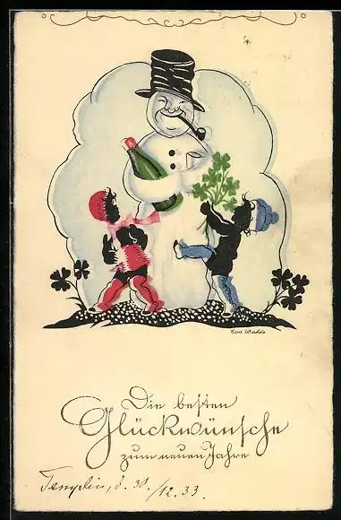 AK Kinder feiern mit einem Schneemann Neujahr