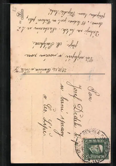 Personenbezogene Daten auf der Rückseite der Karte wurden durch blauen Textmarker unkenntlich gemacht. Die blauen Stellen sind auf die Vorderseite durchgeweicht und wirken sich negativ auf das Postkartenfoto aus