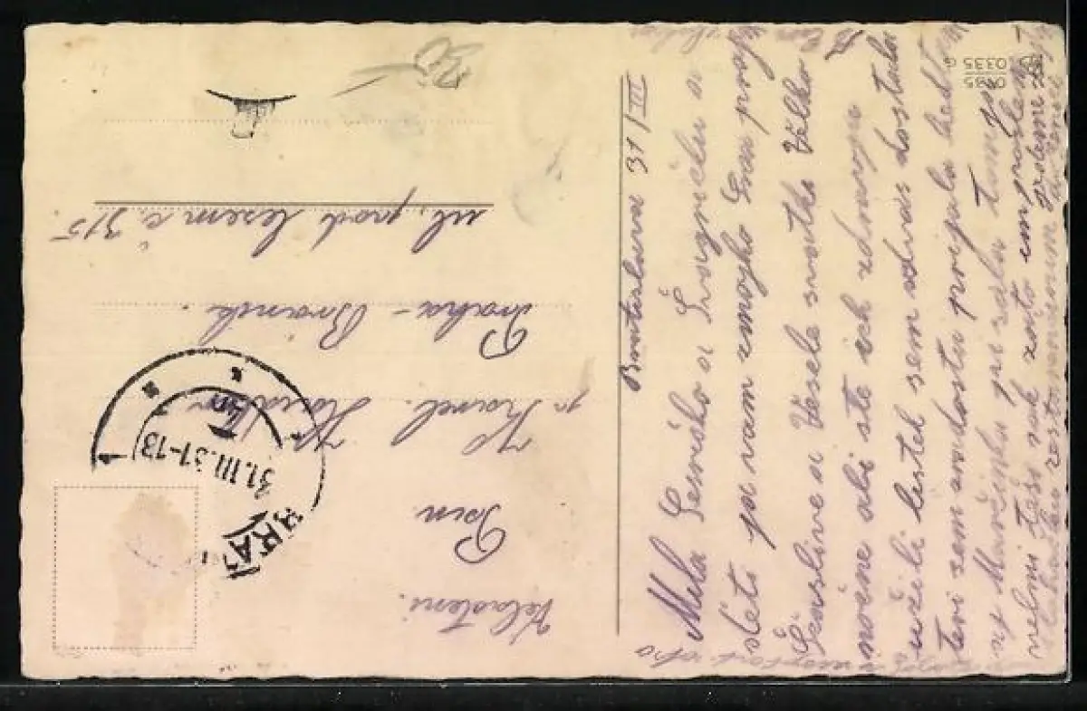 Personenbezogene Daten auf der Rückseite der Karte wurden durch blauen Textmarker unkenntlich gemacht. Die blauen Stellen sind auf die Vorderseite durchgeweicht und wirken sich negativ auf das Postkartenfoto aus