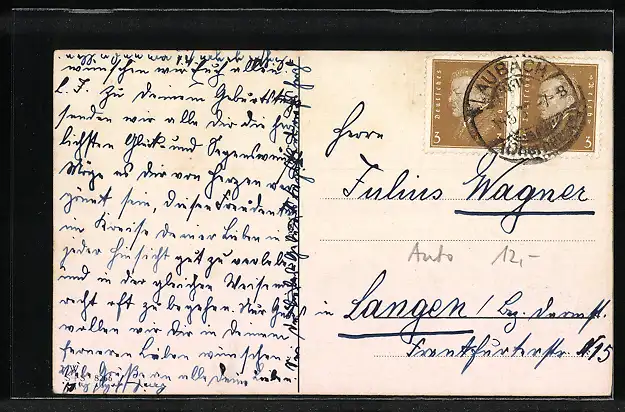 Personenbezogene Daten auf der Rückseite der Karte wurden durch blauen Textmarker unkenntlich gemacht. Die blauen Stellen sind auf die Vorderseite durchgeweicht und wirken sich negativ auf das Postkartenfoto aus