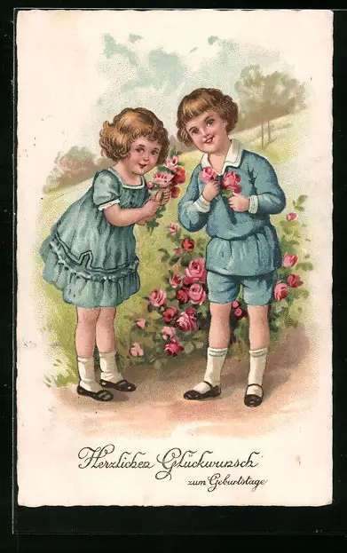 AK Kinder mit Blumen gratulieren zum Geburtstag