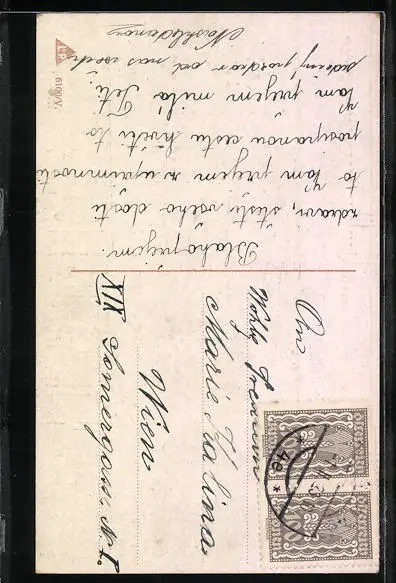 Personenbezogene Daten auf der Rückseite der Karte wurden durch blauen Textmarker unkenntlich gemacht. Die blauen Stellen sind auf die Vorderseite durchgeweicht und wirken sich negativ auf das Postkartenfoto aus