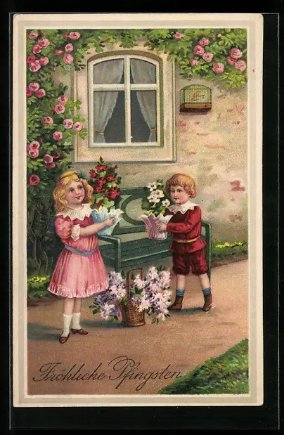 AK Kinder mit Blumengestecken zu Pfingsten