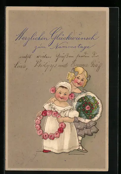 AK Kinder mit Blumensträussen zum Namenstag