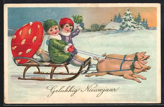 AK Kinder mit Fliegenpilz auf Schweineschlitten, Neujahrsgruss