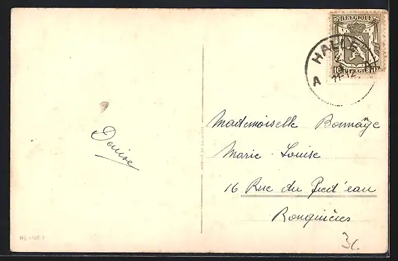 Personenbezogene Daten auf der Rückseite der Karte wurden durch blauen Textmarker unkenntlich gemacht. Die blauen Stellen sind auf die Vorderseite durchgeweicht und wirken sich negativ auf das Postkartenfoto aus
