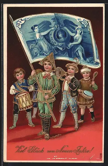 AK Kinder mit Geld-Fahne, Neujahrsgruss