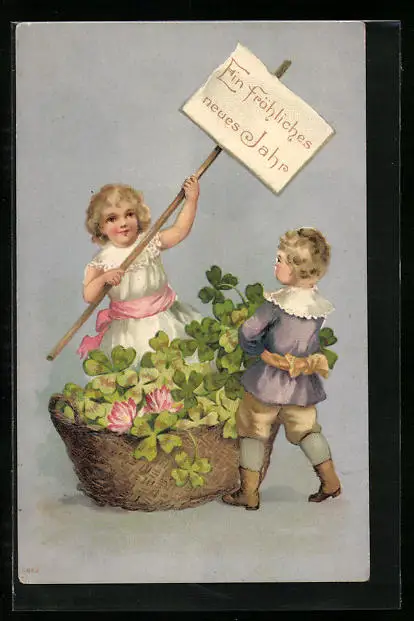 AK Kinder mit Korb voller Kleeblättern
