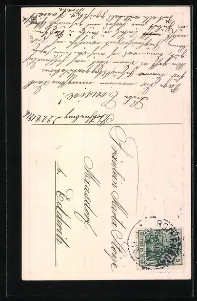 Personenbezogene Daten auf der Rückseite der Karte wurden durch blauen Textmarker unkenntlich gemacht. Die blauen Stellen sind auf die Vorderseite durchgeweicht und wirken sich negativ auf das Postkartenfoto aus
