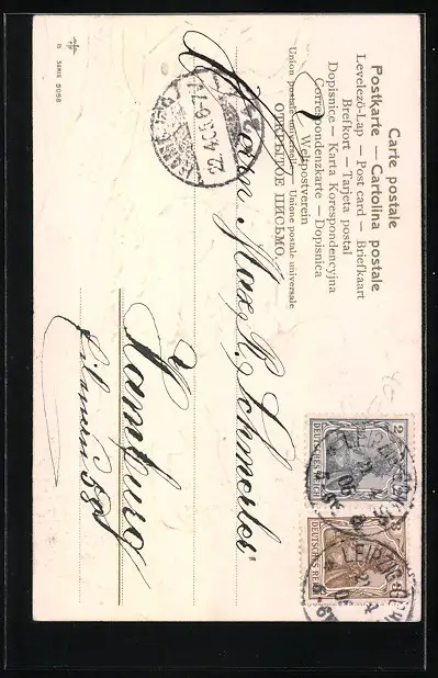 Personenbezogene Daten auf der Rückseite der Karte wurden durch blauen Textmarker unkenntlich gemacht. Die blauen Stellen sind auf die Vorderseite durchgeweicht und wirken sich negativ auf das Postkartenfoto aus