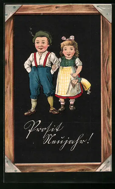 AK Kinder mit Puppe auf Schultafel, Neujahr