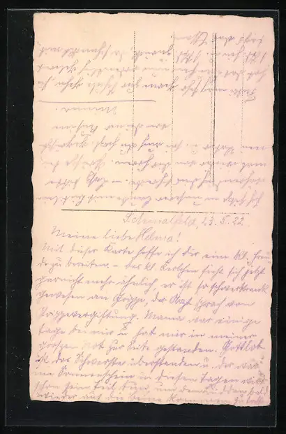 Personenbezogene Daten auf der Rückseite der Karte wurden durch blauen Textmarker unkenntlich gemacht. Die blauen Stellen sind auf die Vorderseite durchgeweicht und wirken sich negativ auf das Postkartenfoto aus