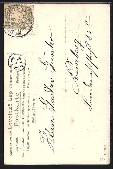Personenbezogene Daten auf der Rückseite der Karte wurden durch blauen Textmarker unkenntlich gemacht. Die blauen Stellen sind auf die Vorderseite durchgeweicht und wirken sich negativ auf das Postkartenfoto aus
