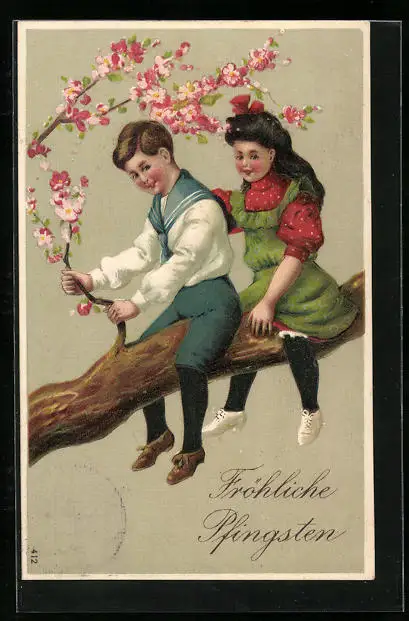 AK Kinder sitzen auf einem Ast zu Pfingsten