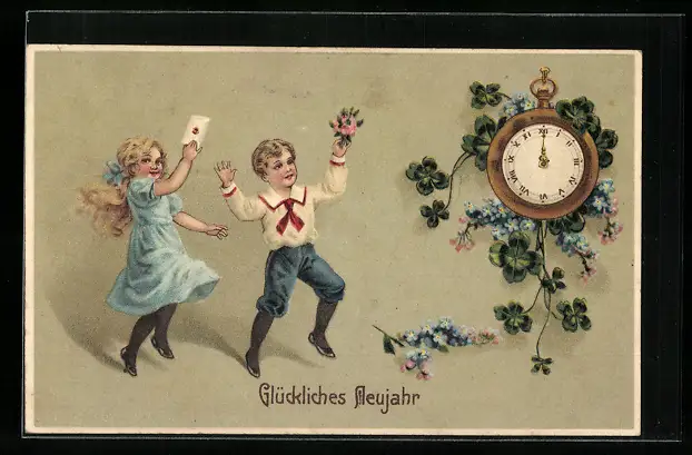 AK Kinder tanzen zu Neujahr, Kleeblätter ranken um eine Uhr