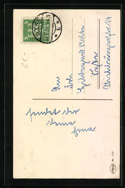 Personenbezogene Daten auf der Rückseite der Karte wurden durch blauen Textmarker unkenntlich gemacht. Die blauen Stellen sind auf die Vorderseite durchgeweicht und wirken sich negativ auf das Postkartenfoto aus