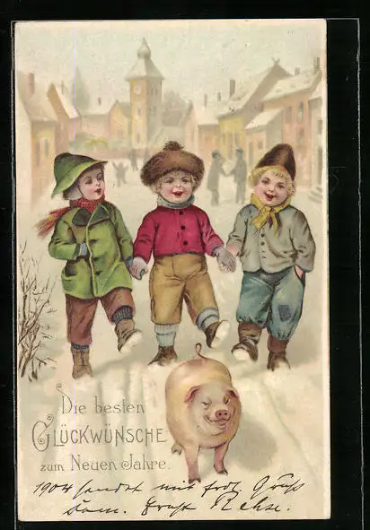 AK Kindergruppe mit Schwein, Neujahrsgruss