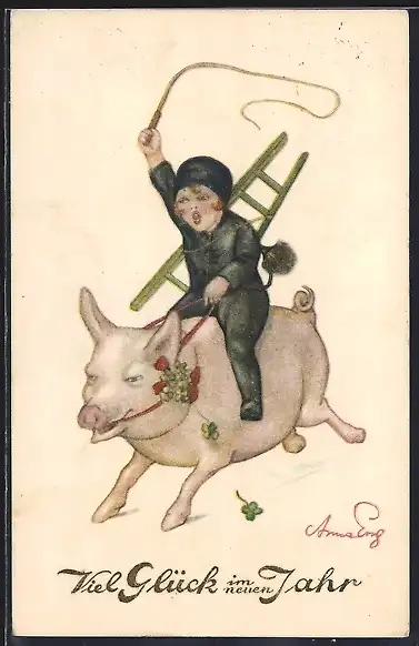 AK Kindlicher Schornsteinfeger reitet auf einem Schwein