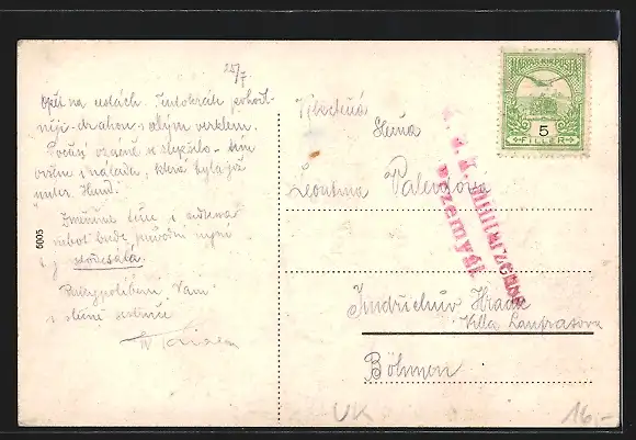 Personenbezogene Daten auf der Rückseite der Karte wurden durch blauen Textmarker unkenntlich gemacht. Die blauen Stellen sind auf die Vorderseite durchgeweicht und wirken sich negativ auf das Postkartenfoto aus