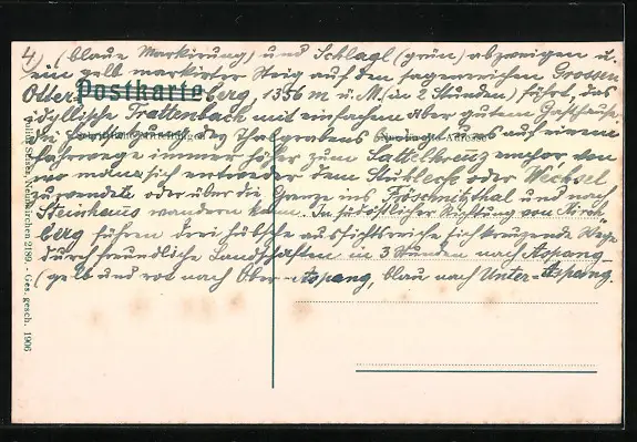 Personenbezogene Daten auf der Rückseite der Karte wurden durch blauen Textmarker unkenntlich gemacht. Die blauen Stellen sind auf die Vorderseite durchgeweicht und wirken sich negativ auf das Postkartenfoto aus