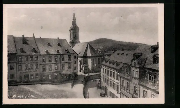 AK Kirchberg i. Sa., Strassenpartie mit Kirche
