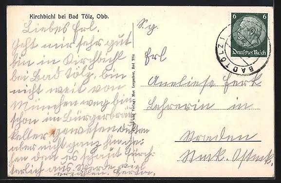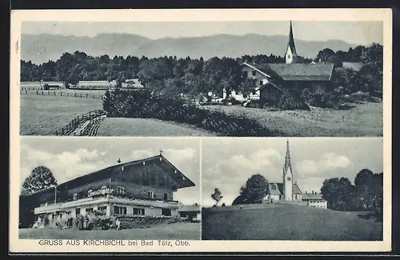 AK Kirchbichl /Bad Tölz, Gebäudeansicht, Kirche, Ortsansicht mit Bergpanorama