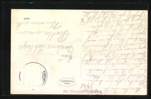 Personenbezogene Daten auf der Rückseite der Karte wurden durch blauen Textmarker unkenntlich gemacht. Die blauen Stellen sind auf die Vorderseite durchgeweicht und wirken sich negativ auf das Postkartenfoto aus