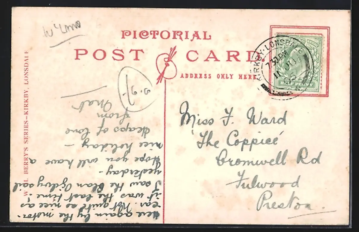 Personenbezogene Daten auf der Rückseite der Karte wurden durch blauen Textmarker unkenntlich gemacht. Die blauen Stellen sind auf die Vorderseite durchgeweicht und wirken sich negativ auf das Postkartenfoto aus