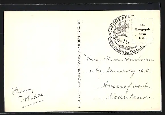 gelaufen 1954, Briefmarke entfernt, Papierreste auf der Vorderseite li. oben, guter Zustand