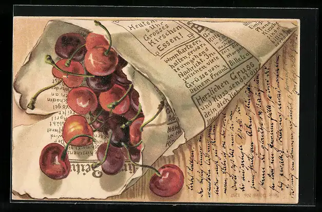 AK Kirschen in Zeitungspapier gewickelt, Obst