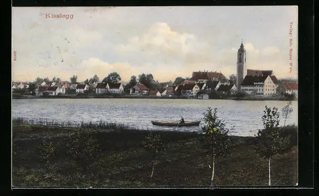 AK Kisslegg, Uferpartie mit Kirche und Boot