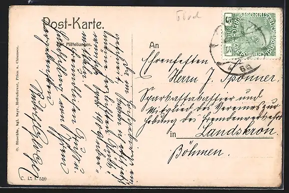 Personenbezogene Daten auf der Rückseite der Karte wurden durch blauen Textmarker unkenntlich gemacht. Die blauen Stellen sind auf die Vorderseite durchgeweicht und wirken sich negativ auf das Postkartenfoto aus
