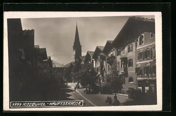 AK Kitzbühel, Hauptstrasse mit Turm im Hintergrund