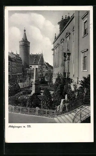 AK Kitzingen a. M., Strassenpartie mit Geschäft und Denkmal