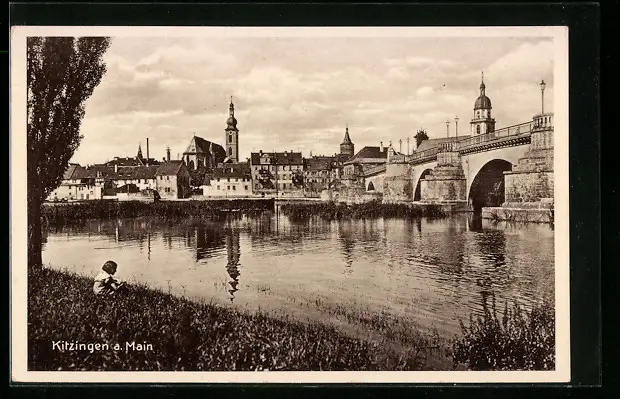 AK Kitzingen am Main, Kind auf der Wiese am Mainufer, Blick zur Stadt