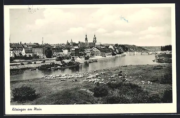 AK Kitzingen am Main, Ortsansicht mit Schafherde am Ufer