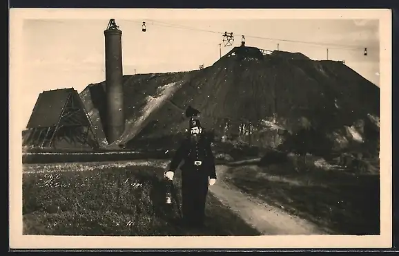 AK Kladno, Bergmann in Uniform vor einer Kohlegrube