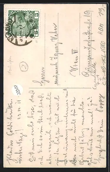 Personenbezogene Daten auf der Rückseite der Karte wurden durch blauen Textmarker unkenntlich gemacht. Die blauen Stellen sind auf die Vorderseite durchgeweicht und wirken sich negativ auf das Postkartenfoto aus