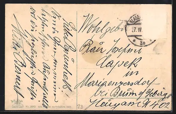 alte Ansichtskarte, gelaufen, Briefmarke entfernt, rückseitig Oberflächenschaden, Stempelspur, guter Zustand