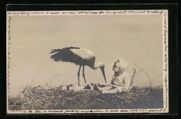AK Klapperstorch mit Kleinkind in einem Vogelnest