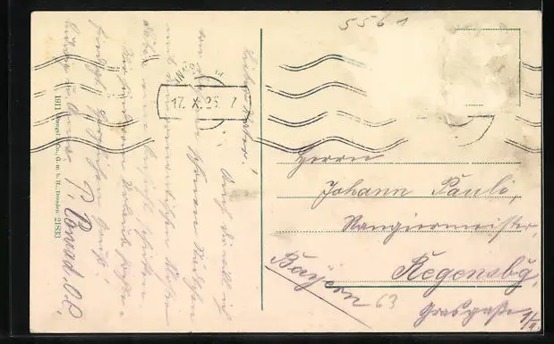 Personenbezogene Daten auf der Rückseite der Karte wurden durch blauen Textmarker unkenntlich gemacht. Die blauen Stellen sind auf die Vorderseite durchgeweicht und wirken sich negativ auf das Postkartenfoto aus