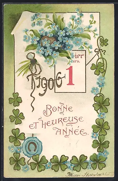 AK Kleeblätter mit Neujahrsgruss 1906, Kalenderblatt und Vergissmeinnicht