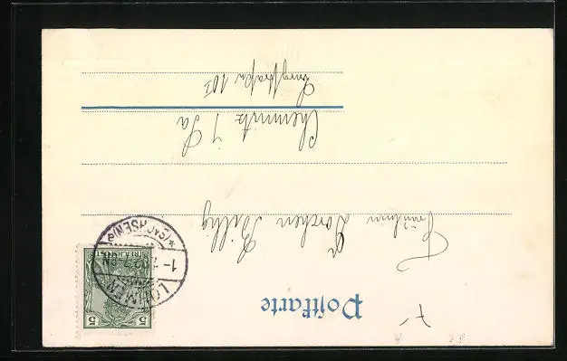 Personenbezogene Daten auf der Rückseite der Karte wurden durch blauen Textmarker unkenntlich gemacht. Die blauen Stellen sind auf die Vorderseite durchgeweicht und wirken sich negativ auf das Postkartenfoto aus