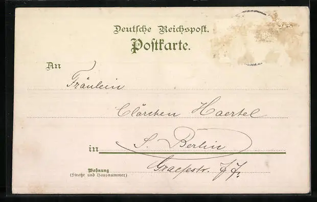 Personenbezogene Daten auf der Rückseite der Karte wurden durch blauen Textmarker unkenntlich gemacht. Die blauen Stellen sind auf die Vorderseite durchgeweicht und wirken sich negativ auf das Postkartenfoto aus