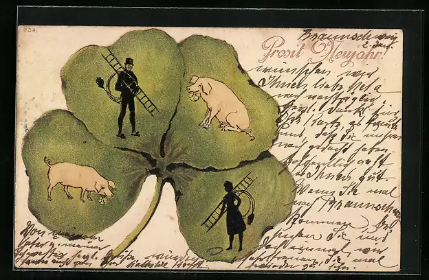 AK Kleeblatt mit Schornsteinfeger und Glücksschwein, Prosit Neujahr