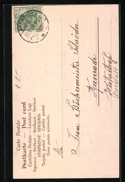 Personenbezogene Daten auf der Rückseite der Karte wurden durch blauen Textmarker unkenntlich gemacht. Die blauen Stellen sind auf die Vorderseite durchgeweicht und wirken sich negativ auf das Postkartenfoto aus