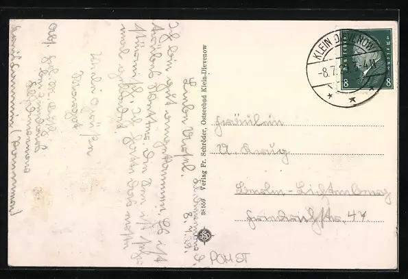 Personenbezogene Daten auf der Rückseite der Karte wurden durch blauen Textmarker unkenntlich gemacht. Die blauen Stellen sind auf die Vorderseite durchgeweicht und wirken sich negativ auf das Postkartenfoto aus