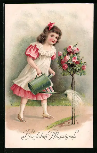 AK Kleine Gärtnerin giesst einen Rosenstrauch
