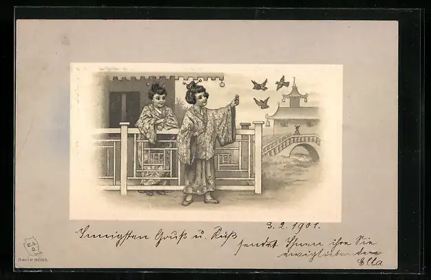 AK Kleine Geishas beim Füttern von Vögeln